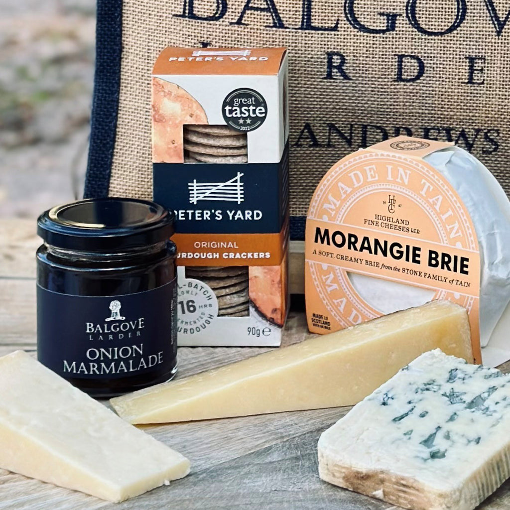 The ultimate hamper for any wine and cheese enthusiast. We've paired four of our favourite Scottish cheeses - a classic combo of cheddar, brie, blue and smoked - with a deep, spicy Côtes Du Rhône and a buttery white Burgundy. To compliment we've selected a variety of oatcakes and crispbread. Rounding it all off is a dollop of white truffle honey and our very own tasty Balgove Onion Marmalade.